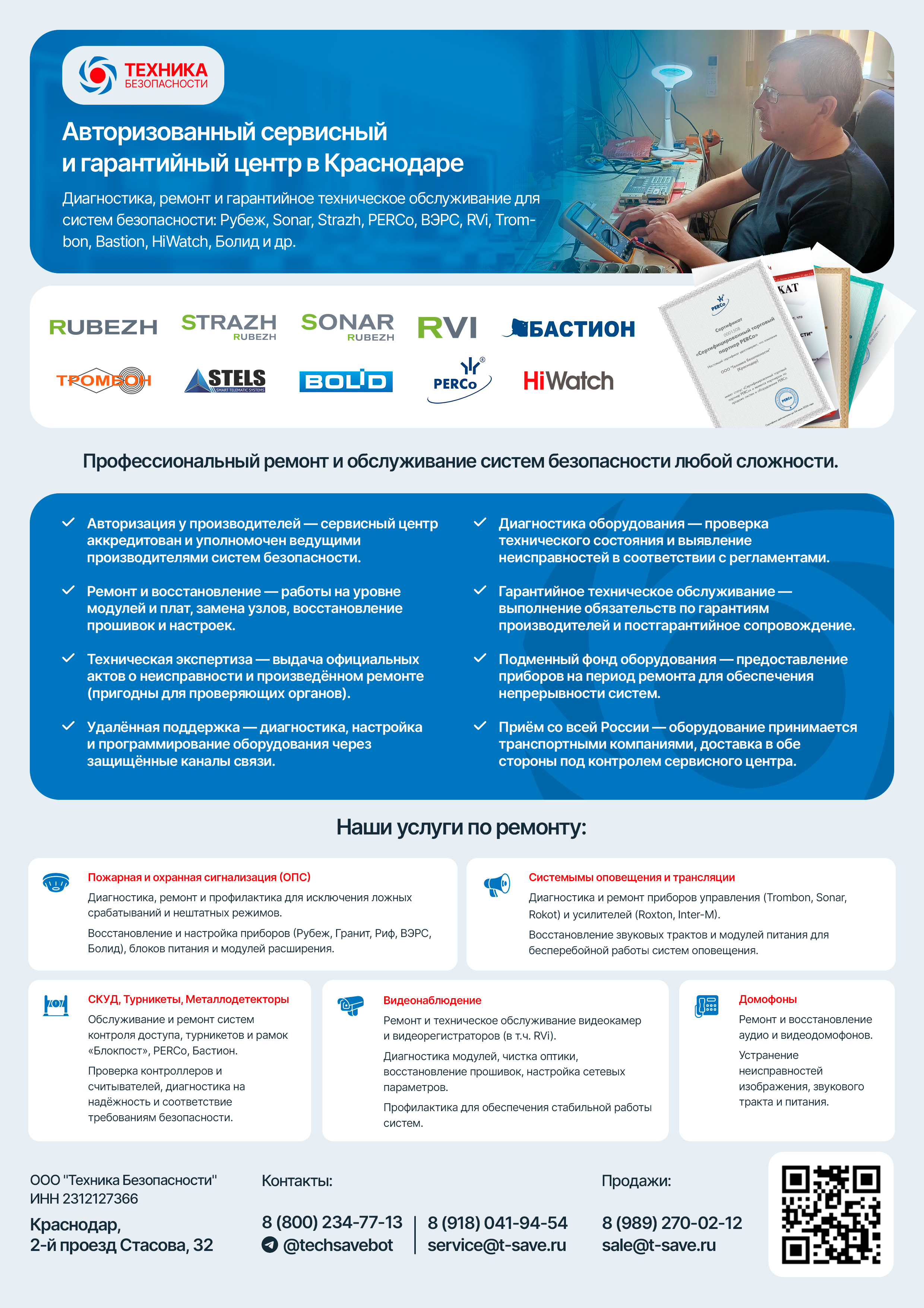 В гарантийной ремонтной мастерской "Техника безопасности" в Краснодаре можно заказать диагностику, настройку, срочный ремонт приборов и датчиков, блоков питания сигнализации, видеонаблюдения контроля доступа или техническую экспертизу неисправного оборудования и приборов с выдачей Акта технического заключения. Ремонт, диагностика сигнализации осуществляется квалифицированными специалистами с многолетним опытом работы по диагностике и ремонту широкого спектра оборудования как отечественных, так и зарубежных производителей. Мы являемся авторизованным сервисным центром по гарантийному ремонту таких производителей и брендов как: Рубеж, СОНАР, RVi, Тромбон, Бастион, PERCo, ВЭРС, Rvi, Арсенал безопасности, а так же являемся сервисным центром постгарантийного обслуживания и ремонта техники производства ЗАО НВП "Болид" и диагностическим центром бренда бренда HiWatch и продукции завода НПП Стелс (Мираж, Stemax, Livi).